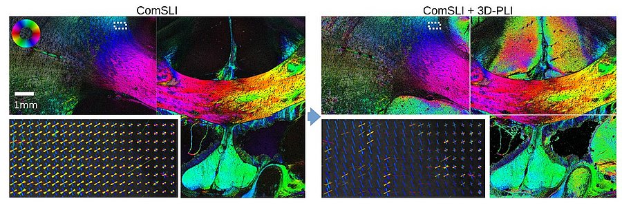 Die farblich gekennzeichneten Verläufe der Nervenfasern zeigen, dass die mittels Kombination von ComSLI und 3D-PLI (rechts) gemessenen Faserrichtungen präzisere Signale liefern als durch eine alleinige Verwendung der ComSLI-Methode (links).