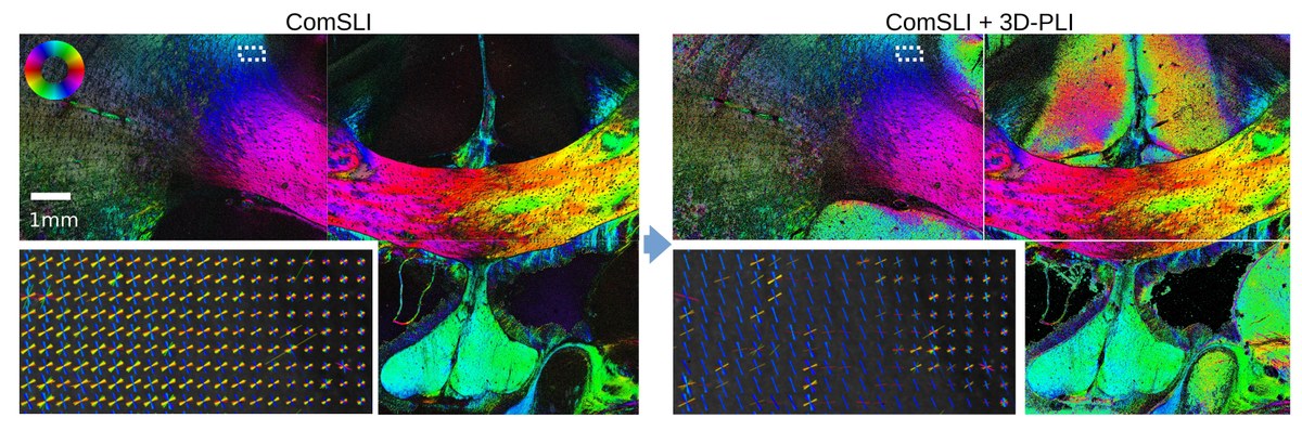 Forschende der Arbeitsgruppe um Markus Axer haben ein kombiniertes Messsystem vorgestellt, das zwei etablierte Verfahren vereint: 3D Polarized Light Imaging (3D-PLI) und Computational Scattered Light Imaging (ComSLI). Bisher wurden diese Techniken getrennt eingesetzt, doch in dem neuen Streu-Polarimeter lassen sich beide Messprinzipien simultan anwenden.