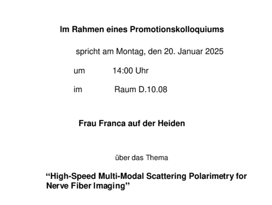 Promotionskolloquium von Franca auf der Heiden am 20. Januar 2025 um 14:00 Uhr in D.10.08 über “High-Speed Multi-Modal Scattering Polarimetry for Nerve Fiber Imaging”