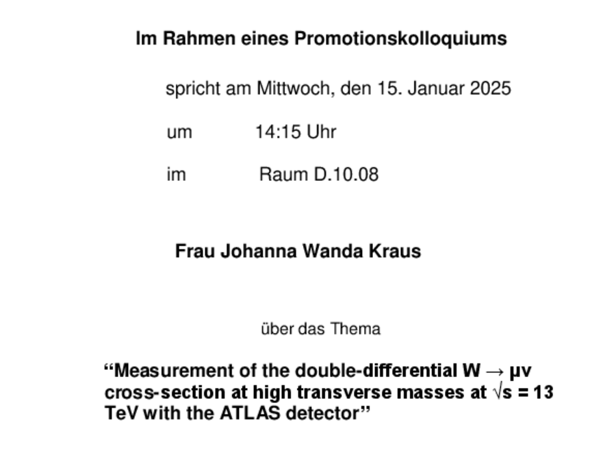 Promotionskolloquium von Johanna Wanda Kraus am 15. Januar 2025 um 14:15 Uhr in D.10.08 über “Measurement of the double-differential W → μν cross-section at high transverse masses at √s = 13 TeV with the ATLAS detector”