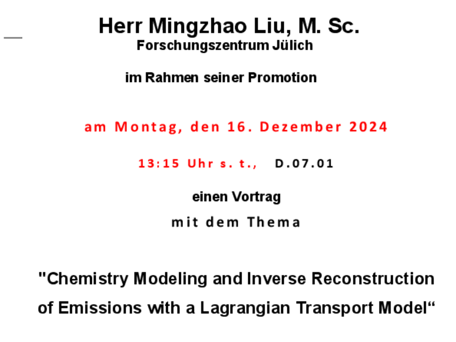 Promotionskolloquium von Mingzhao Liu am 16. Dezember 2024 um 13:15 Uhr in D.07.01 über "Chemistry Modeling and Inverse Reconstruction of Emissions with a Lagrangian Transport Model"