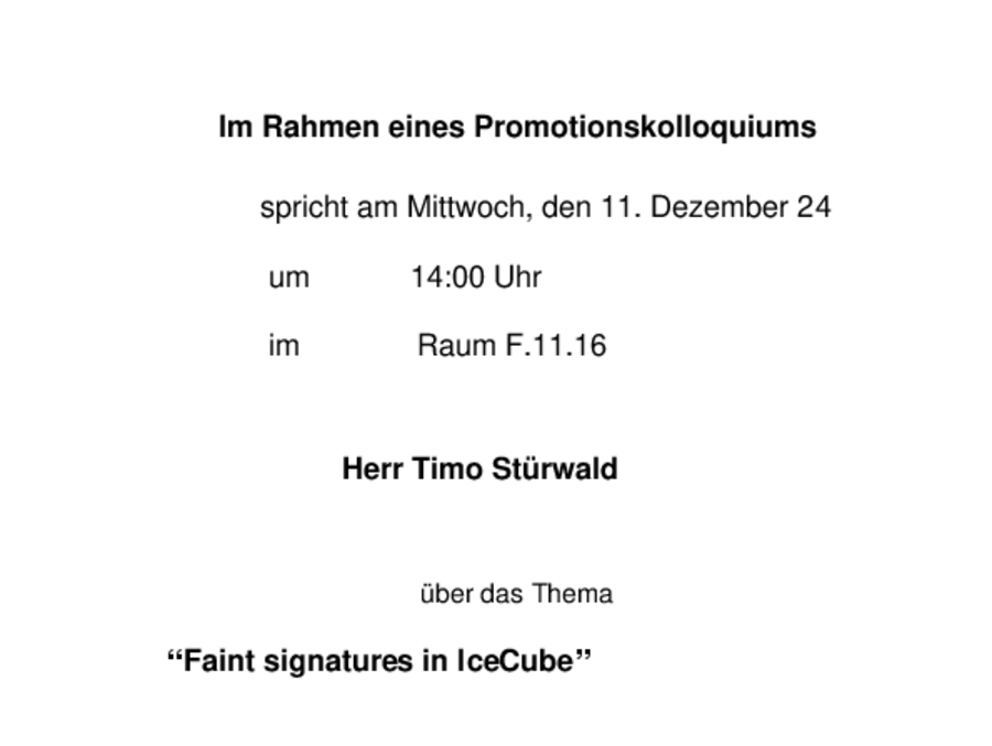 Promotionskolloquium von Timo Stürwald am 11. Dezember 2024 um 14 Uhr in F.11.16 über "Faint signatures in IceCubes"