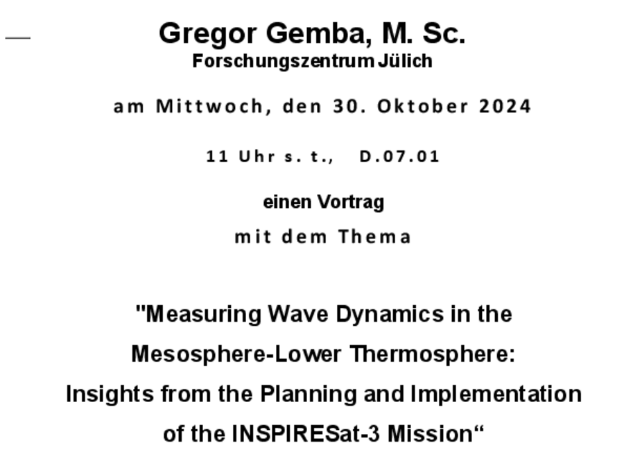 Gregor Samba vom Forschungszentrum Jülich hält am 30.10. um 11 Uhr s.t. einen Vortrag in D.07.01 zu "Measuring Wave Dynamics in the Mesosphere-Lower Thermosphere: Insights from the Planning and Implementation of the INSPIRESat-3 Mission“